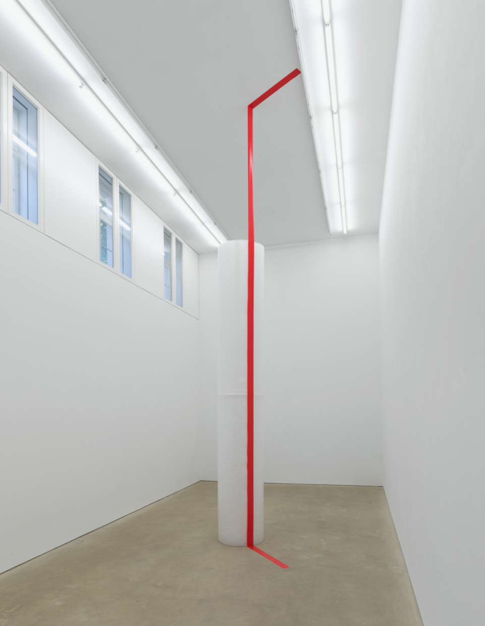 "Ist das schon die Ausstellung oder wird sie noch aufgebaut? "Ayse Erkmen hat für Marie 10 eine Installation konzipiert, die einfacher nicht sein könnte und gleichzeitig einen wichtigen Ausgangspunkt für jede Initiative für zeitgenössische Kunst auf den Punkt bringt: den Raum selbst, seine Form, seine Qualität. In ihm erhebt sich ein einziges Element, das ein Maß bestimmt und Boden und Decke miteinander verbindet. Was wie der Archetyp einer Säule aussieht, ist jedoch nichts anderes als eine große Rolle Luftpolsterfolie, die mit einem roten Klebeband vom Boden bis zur Decke den Raum und die Folienrolle verbindet. Alltägliches Verpackungsmaterial aus dem Kunstbetrieb hat sich gleichsam "verselbständigt" und in Skulptur und Installation verwandelt." (Julian Heynen)